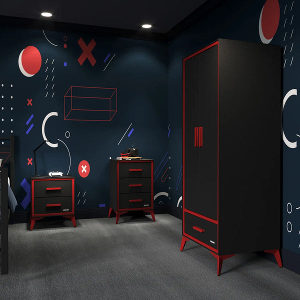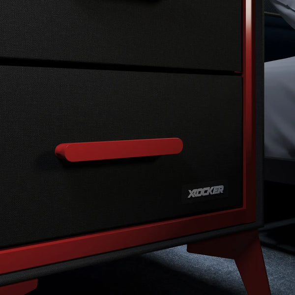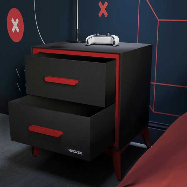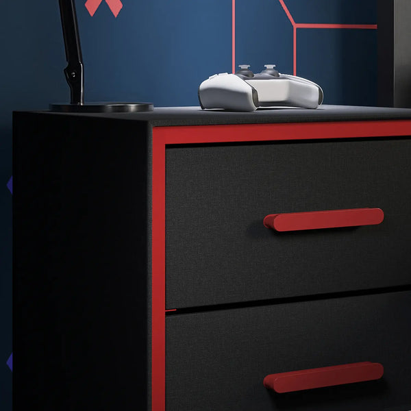Keep your bedroom gaming space organised and stylish with this gamer-inspired canvas bedside table. The Arcane features two spacious drawers, making it perfect for storing controllers, games, headphones, and bedtime essentials, keeping clutter out of sight but always within reach. Built with durable black canvas fabric and reinforced MDF panels, the Arcane is designed to last through everyday use. The sturdy steel frame and feet, paired with bold red handles, give it a modern, gaming-inspired look that kids, teens and adults alike will love. A smart, functional addition that levels up any gaming bedroom without sacrificing style.