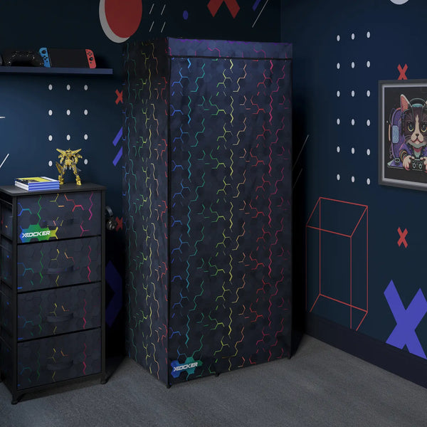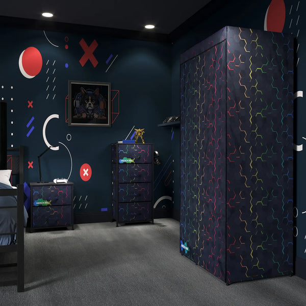 Keep your space neat, safe, and stylish with the Hex Print Canvas Wardrobe - a practical storage solution with a fun, modern twist, perfect for a kid or teens bedroom. Designed with growing gamers in mind, this wardrobe features three durable shelves and a hanging space for plenty of clothes, perfect for storing everything from shirts and socks to books, accessories, and cozy blankets. The sleek black wooden top offers the ideal spot for displaying collectibles or a gaming headset, while the sturdy steel frame with built-in back support and wall attachments keeps things stable - even during the most energetic play sessions. Easy to assemble and compact enough to fit in bedrooms, or playrooms, the Hex Print Wardrobe helps kids stay organised while giving parents peace of mind. A smart, stylish way to keep clutter under control, so your young gamer can focus on the fun.