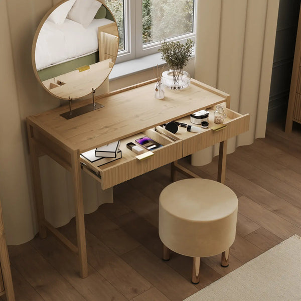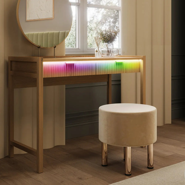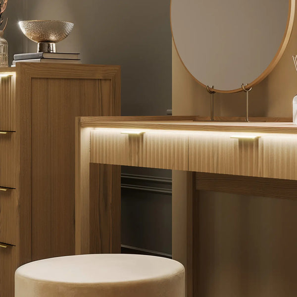 The Dakota dressing table in a warm wild oak effect finish combines natural texture with modern functionality. Designed with integrated lighting, it features touch-button or app-controlled LEDs that softly illuminate from the front top edge. The gentle glow cascades down over the fluted drawer front, highlighting its elegant detailing and creating a calm, ambient atmosphere, perfect for winding down at the end of the day.