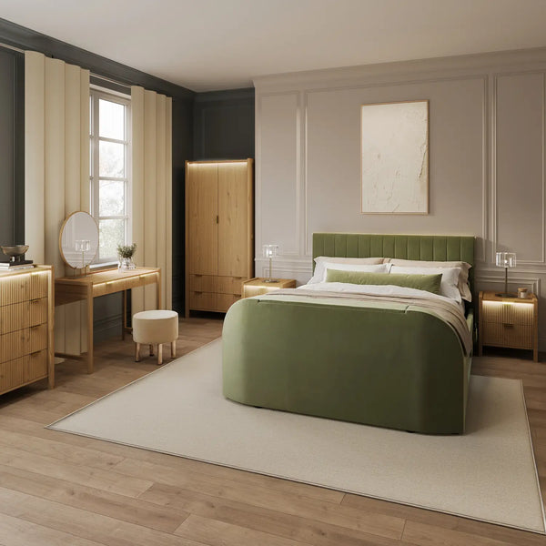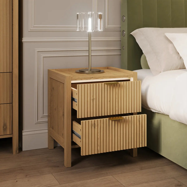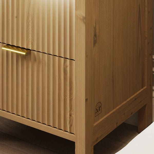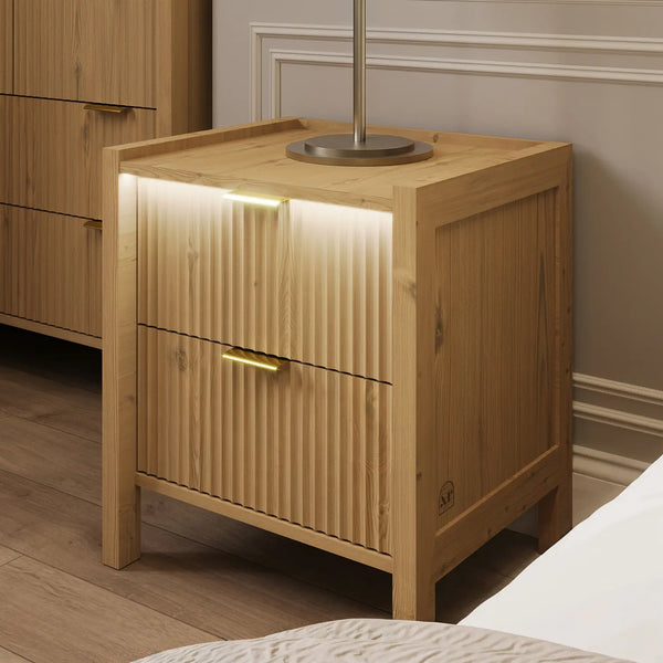Meet the Dakota side table, where warm wild oak beauty meets modern convenience. Its sleek, built-in lighting creates a soft, soothing glow that gently washes over the fluted drawer front, adding instant ambience to your space. With easy touch-button control or app-enabled LEDs, you can set the mood in seconds. It’s the perfect companion for relaxing evenings, cosy routines, and effortlessly stylish bedrooms.