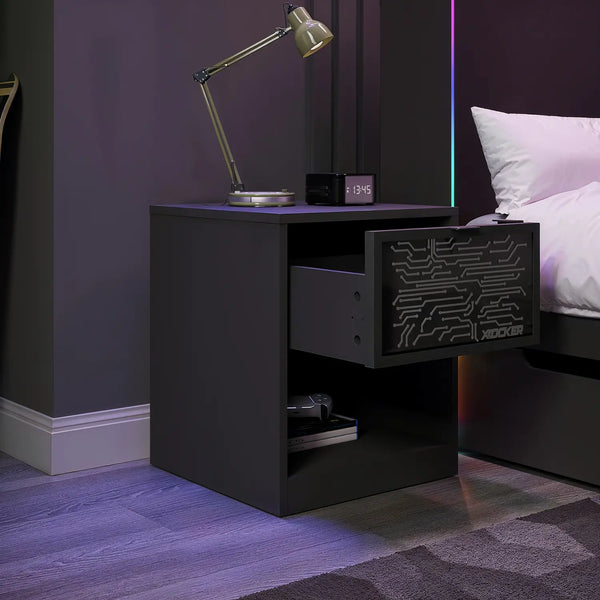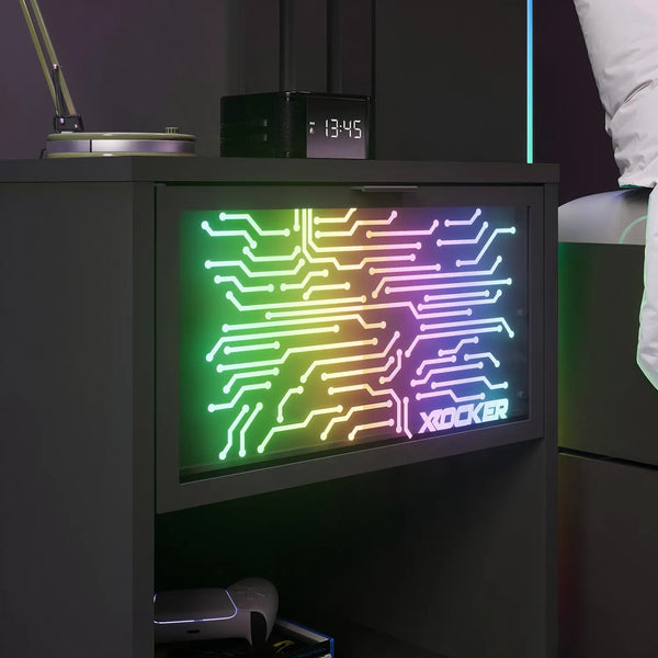Glow up your Gaming Space with the NeoNite Light Up Bedside Table from X Rocker. The NeoNite Bedside feature a singular drawer, smooth finish, circuit-style LED lighting and a sturdy wooden frame that make the bedside look timeless in any bedroom. Equipped with Neo Motion™ Sync LED technology, the NeoNite range gives you access to over 200 colour modes, patterns and even sound reactive lighting with the touch of a button! Simply sync and control the lighting systems on multiple NeoNite items and other compatible Neo Motion Sync products via the app and watch your room light up in perfect harmony. Powered by a USB cable to your choice of power supply, wall adapter or power bank not included.