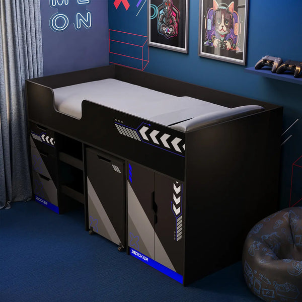 Make the most of your bedroom space like never before with the Octane Mid Sleeper Cabin Bed, a high-performance sleep and storage solution designed for gamers and speed fans alike. Inspired by the bold, racing-style visuals of the Octane range, this mid sleeper delivers maximum impact while making smart use of space. Raised to create a compact footprint, the Octane Mid Sleeper cleverly combines multiple essentials into one streamlined design. Beneath the bed you’ll find an integrated storage unit for clothes and gaming gear, along with a smooth pull-out desk that provides the perfect pit stop for homework, gaming sessions, or creative projects. Additional built-in storage keeps everything organised and within easy reach. Finished with dynamic detailing and a sleek, modern look, this cabin bed transforms any bedroom into a high-octane hub for rest, play, and productivity. Ideal for smaller rooms, the Octane Mid Sleeper Cabin Bed is the ultimate fusion of racing-inspired style, comfort, and space-saving practicality. Unfortunately, this item is not currently eligible for shipping to the following postal zones: AB, BT, DD, FK, GY, HS, IM, IV, JE, KA27-28, KW, PA, PH, PO30-41, TR21-25, ZE.